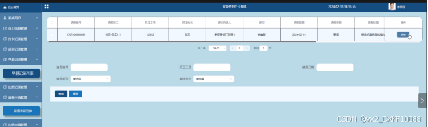 部门负责人可以查看请假申请列表中某一员工的请假详情并进行审核和回复,可以对列表信息进行查询和重置删除操作。其界面如下图4-11所示。