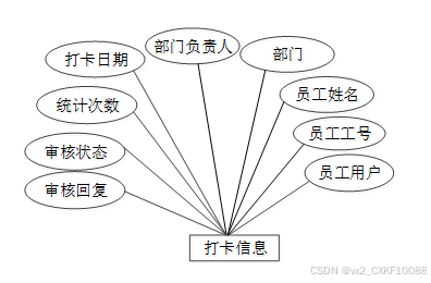 在数据库概念模型设计的时候,一般都采用E-R实体图进行展示,在实体图中可以展示出数据库表中的所有字段名称,基于Spring Boot的打卡系统中的主要的数据库E-R模型图如下图3-3、3-4、3-5所示。