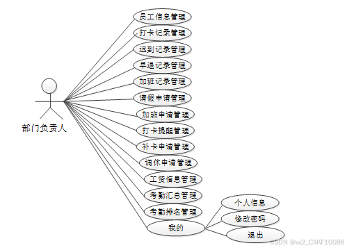 - 部门负责人功能包括员工信息管理、打卡记录管理、迟到记录管理、早退记录管理、加班记录管理、请假申请管理、加班申请管理、打卡提醒管理、补卡申请管、调休申请管理、工资信息管理、考勤汇总管理、考勤排名管理、我的(个人信息、修改密码、退出)。其用例图如下图2-4所示: