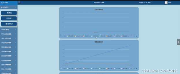 管理员可以查看后台首页展示的打卡记录统计、迟到记录统计、早退记录统计等统计图信息。其界面如下图4-13所示。
