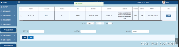管理员可以查看加班申请列表中某一员工的加班申请详情并进行审核和回复,可以对列表信息进行查询和重置删除操作。其界面如下图4-12所示。