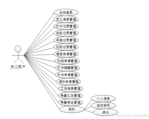 - 员工用户功能主要包括注册登录、员工信息管理、打卡记录管理、迟到记录管理、早退记录管理、加班记录管理、请假申请管理、加班申请管理、打卡提醒管理、补卡申请管、调休申请管理、工资信息管理、考勤汇总管理、考勤排名管理、我的(个人信息、修改密码、退出)。其用例图如下图2-3所示:
