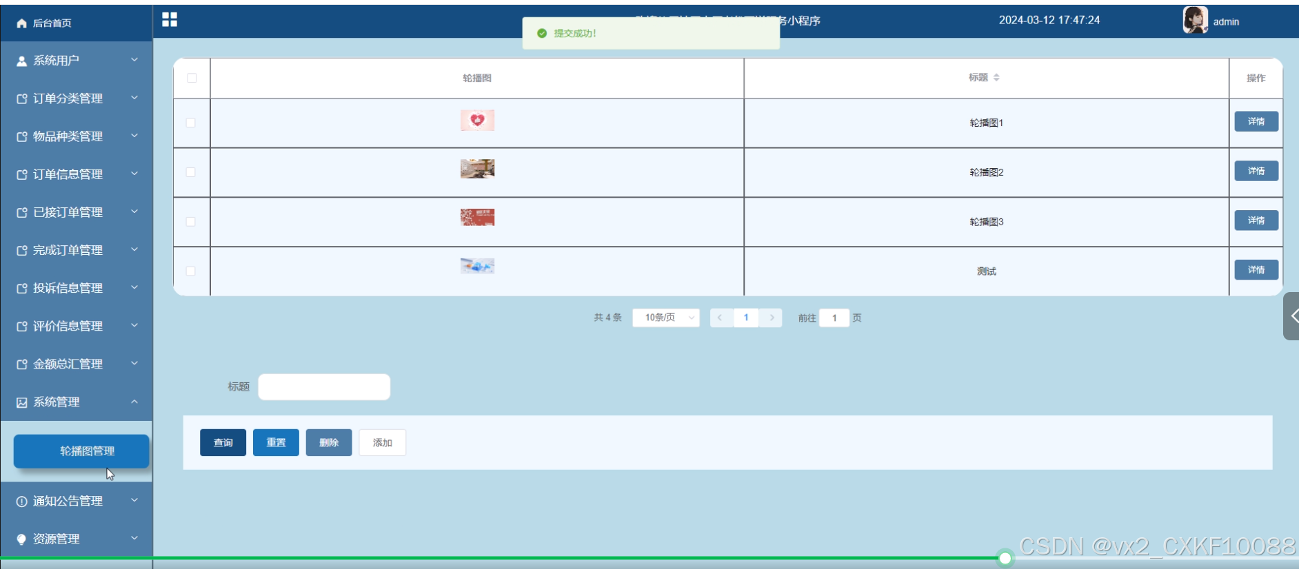 管理员可以对系统前台展示的轮播图进行增删改查,方便用户进行查看。轮播图管理界面如下图所示。