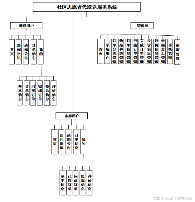 社区志愿者代取送服务系统的设计与实现分为三大部分:管理员模块、普通用户模块和志愿用户。