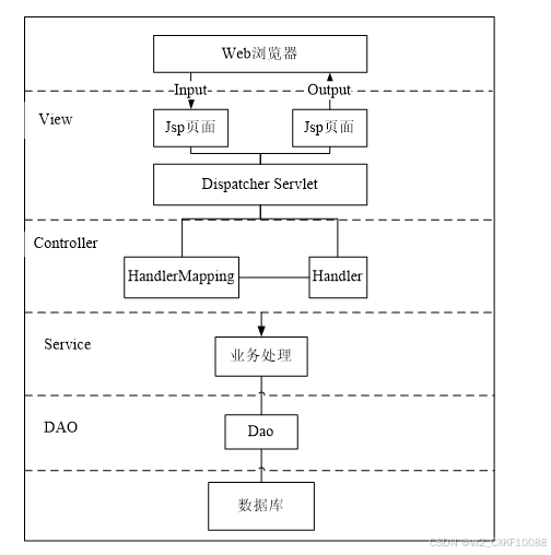 本系统采用MVC结构,结构包括了View、Controller、Service、ServiceImpl、Dao等模块。系统架构图如下图所示。