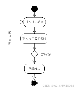 用户可进行登录使用更多功能,首先进入用户登录界面,输入用户账号和密码,后台对账号和密码信息进行核对验证,验证成功则页面直接显示登录用户昵称代表登录成功,否则返回用户登录界面。用户登录活动图如下图。