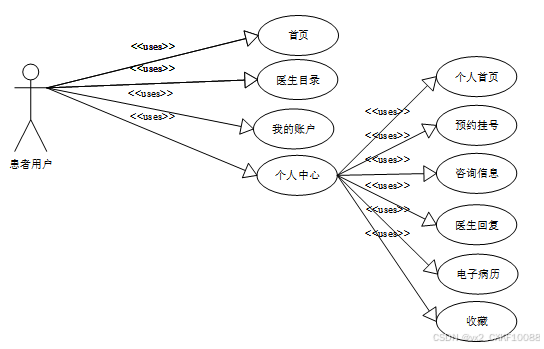 - 患者用户主要使用首页、医生目录、我的账户、个人中心(个人首页、预约挂号、咨询信息、医生回复、电子病历、收藏),下图所示描述患者用户的用例图。