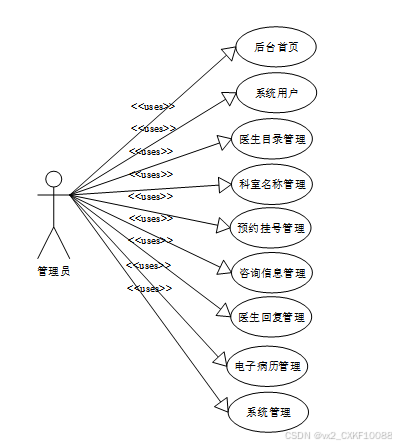 2.管理员主要负责后台首页、系统用户、医生目录管理、科室名称管理、预约挂号管理、咨询信息管理、医生回复管理、电子病历管理、系统管理,下图所示描述管理员的用例图。