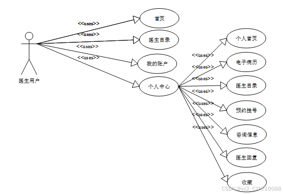 1.医生用户主要使用首页、医生目录、我的账户、个人中心(个人首页、电子病历、医生目录、预约挂号、咨询信息、医生回复、收藏),下图所示为医生用户的用例图。