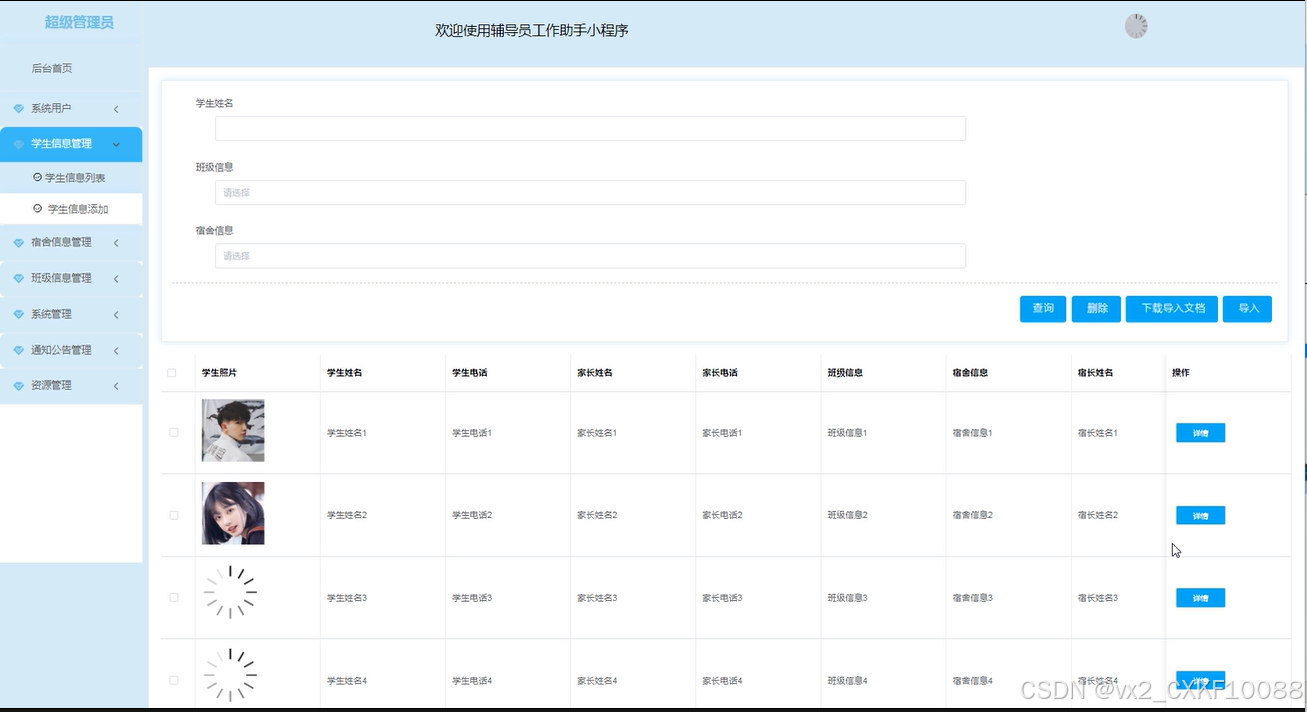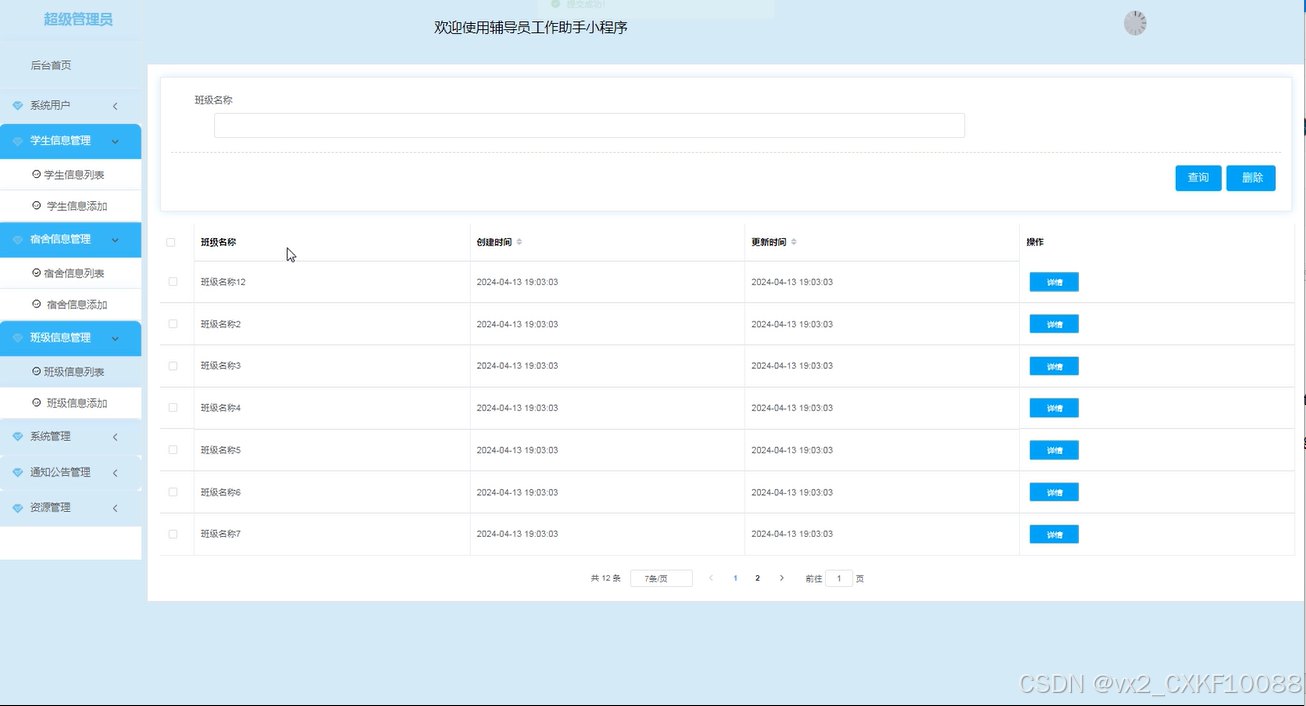 该工作助手的设计旨在实现以下功能模块:用户管理首页、系统用户角色划分(管理员、注册用户)、学生信息管理、宿舍信息管理、班级信息管理、系统管理、通知公告管理、资源管理等。结合SpringBoot框架的特性,该助手将为辅导员提供高效便捷的工作辅助服务。