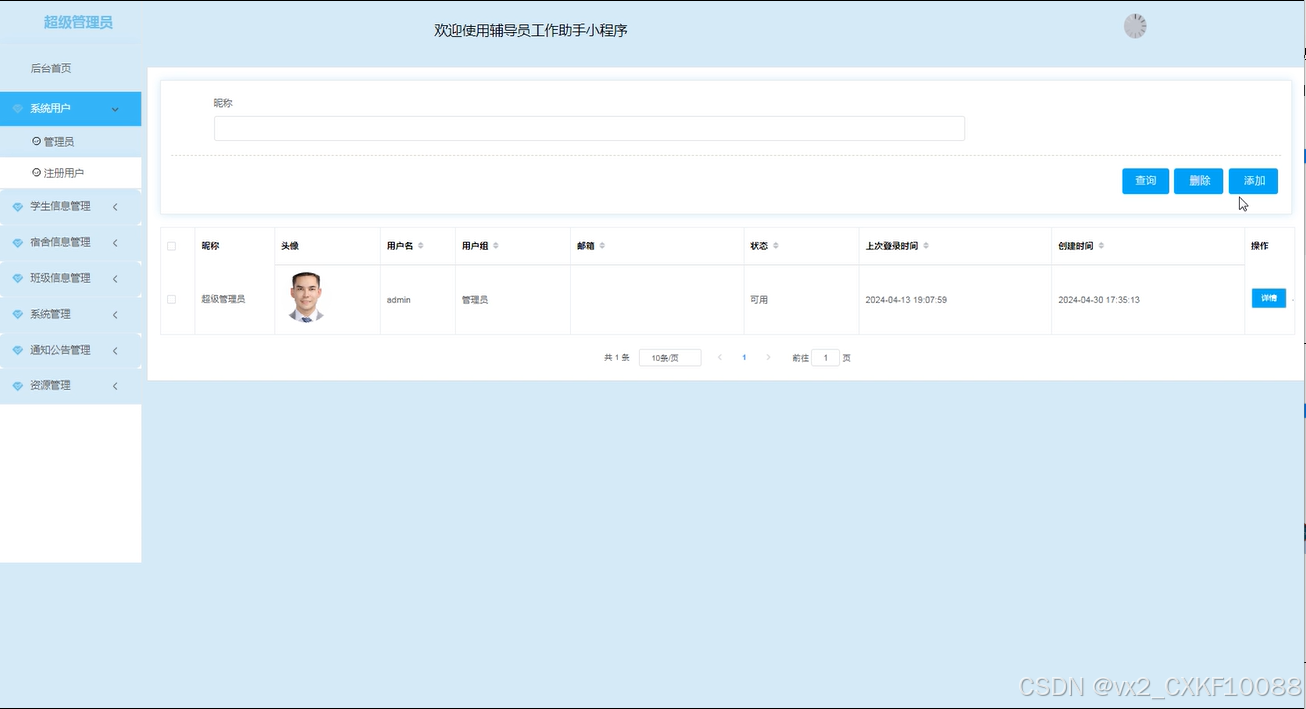(3)系统用户:在系统用户管理模块,管理员可以全面掌控用户信息。管理员不仅可以查询、删除和添加用户,还能查看每个用户的详情。这一功能确保了用户信息的准确性和安全性,同时方便管理员进行用户管理和维护。