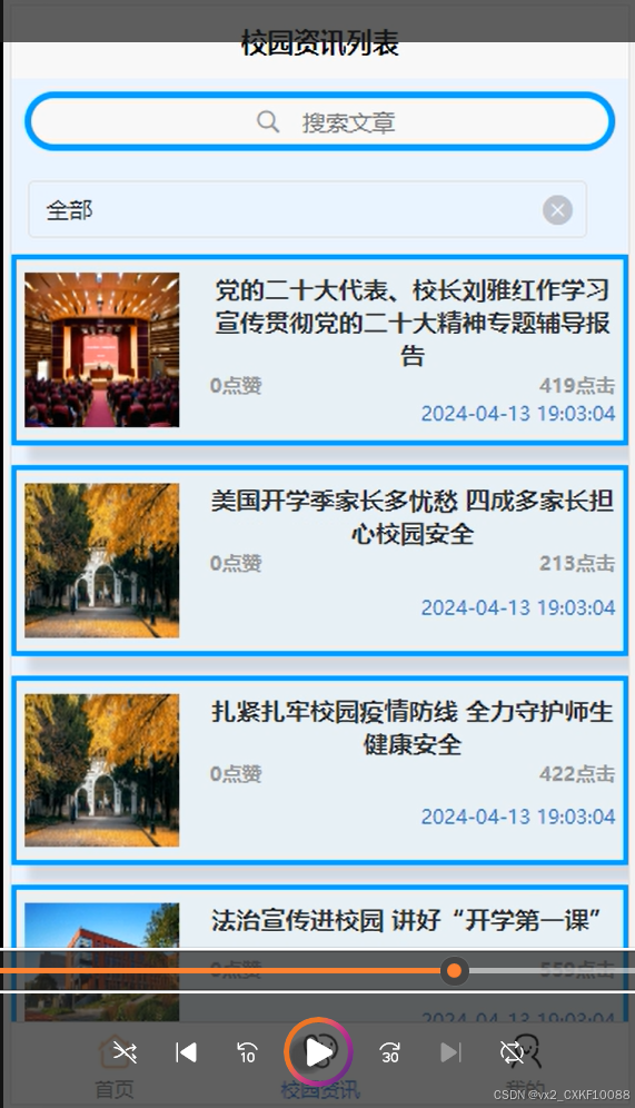 校园资讯:注册用户在校园资讯板块可以浏览学校发布的各类资讯,了解学校的最新动态和活动。用户还可以对感兴趣的资讯进行点赞和收藏,方便日后回顾和学习。这一功能不仅增强了用户的参与感,也促进了学校与学生之间的互动交流。界面图如下。