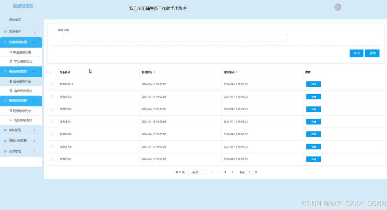 (5)宿舍信息管理:在宿舍信息管理模块,管理员可以管理所有宿舍信息。通过列表、添加、查看详情、查询和删除等功能,管理员可以轻松维护宿舍信息的准确性和完整性。同时,通过宿舍名称搜索功能,管理员可以快速找到特定宿舍的详细信息。