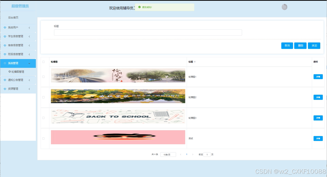 (7)系统管理:在系统管理模块,管理员可以管理轮播图等系统级内容。管理员可以添加、查询、删除轮播图,确保系统界面和内容的及时更新和展示。这一功能对于维护系统形象和用户体验具有重要意义。
