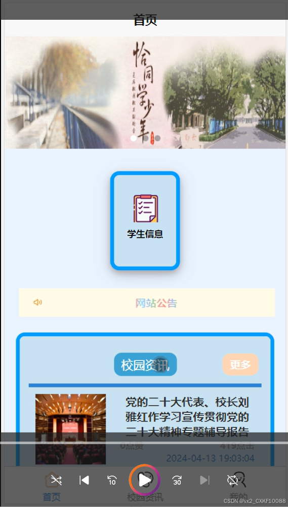 首页:当进入uniapp的辅导员工作助手的时候,可以看到系统中的导航栏,轮播图、学生信息、网站公告、校园资讯和我的等信息,其主界面展示如下图5-8。
