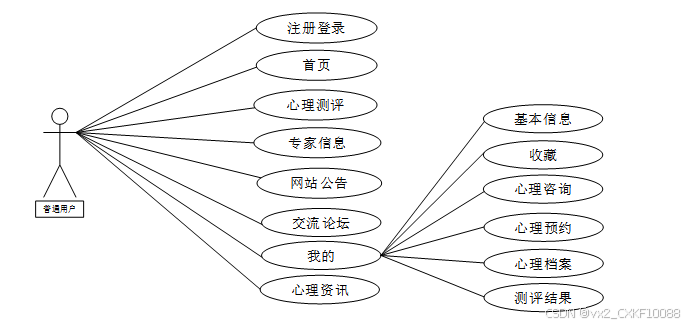普通用户角色的用例包括登录注册、首页、心理测评、专家信息、网站公告、交流论坛、心理资讯、我的(基本信息、收藏、心理咨询、心理预约、心理档案、测评结果)。