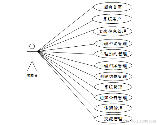 管理员角色的用例包括后台首页、系统用户、专家信息管理、心理咨询管理、心理预约管理、心理档案管理、测评结果管理、系统管理(轮播图管理、敏感词管理)、通知公告管理、资源管理(心理资讯、资讯分类、心理测评)、交流管理(交流论坛、论坛分类)。