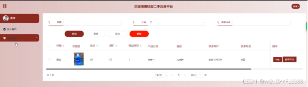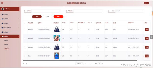- 商城管理:在商城管理菜单包括交易平台和订单列表这两个子菜单,用户可以对交易平台信息进行增删改查操作可以查询、重置和删除订单列表信息。