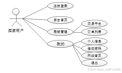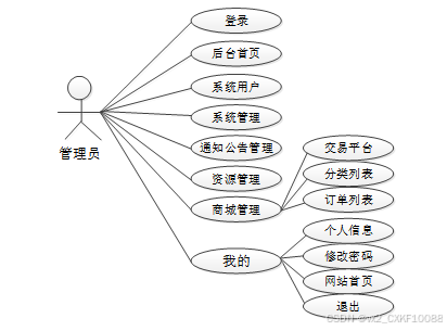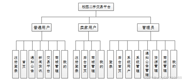 按照校园二手交易平台的角色,主要包括普通用户、卖家用户和管理员这三大功能模块,各模块功能如下。