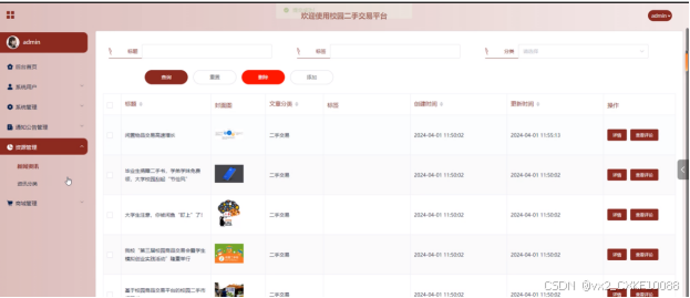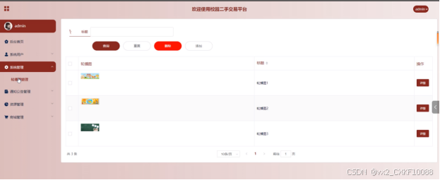 - 系统管理:管理员在“系统管理”这一菜单下对轮播图进行管控,可以对轮播图信息进行增删改查操作。