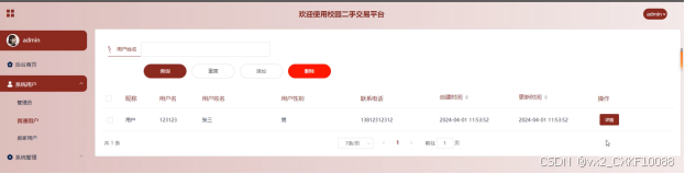 - 系统用户:管理员可以查看系统用户(管理员、普通用户、卖家用户)列表中某一用户的详情,可以对系统用户信息进行增删改查操作。