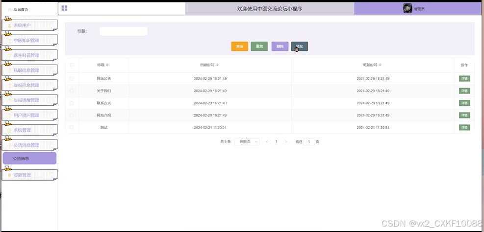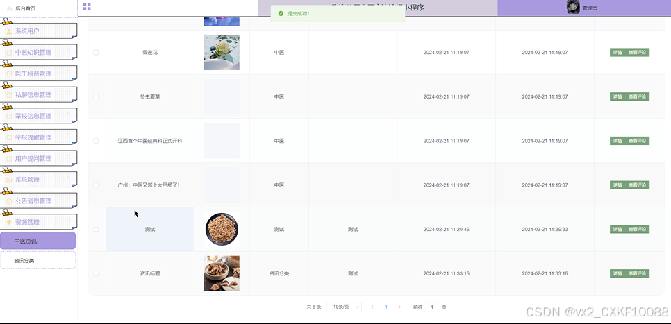 资源管理:管理员可以发布、编辑和删除中医资讯及其分类。