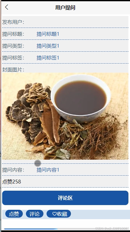 用户点击“用户提问”,可以查看、点赞、收藏、评论其他用户的提问和医生回复,普通用户还可在我的页面用户提问中提交自己的提问信息,用户提问界面如下图4-6所示。