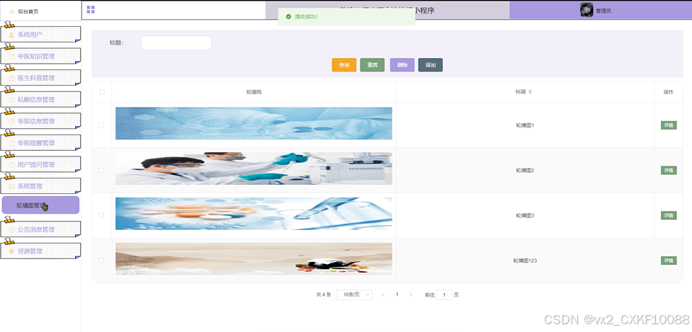 管理员点击“系统管理”这一菜单会显示轮播图这一个子菜单,管理员可以对前台展示的轮播图进行设置,界面如下图所示。