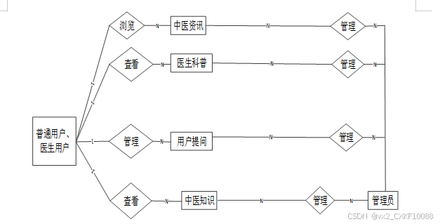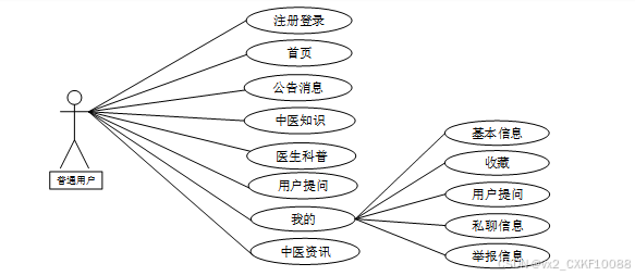 普通用户角色的用例包括登陆注册、首页、公告消息、中医知识、医生科普、用户提问、中医资讯、我的(基本信息、收藏、私聊信息、举报信息、用户提问)。