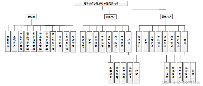 以上是基于微信小程序的中医交流论坛的功能需求分析,每个用户类型都有特定的功能和权限,管理员拥有最高的权限来管理论坛的运行和内容。