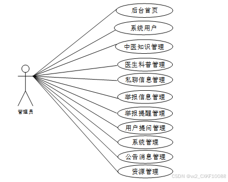 管理员角色的用例包括后台首页、系统用户、中医知识管理、医生科普管理、私聊信息管理、举报信息管理、举报提醒管理、用户提问管理、系统管理、公告消息管理、资源管理。