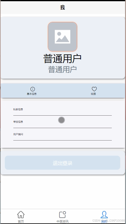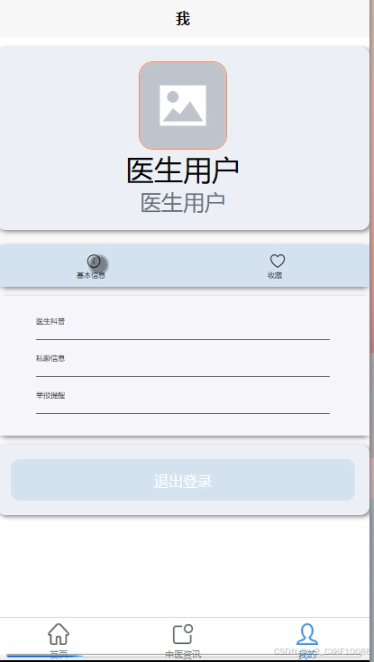 点击基于微信小程序的中医交流论坛端底部的“我的”菜单进入“我的”页面,普通用户可以管理自己的基本信息、收藏、私聊信息、举报信息、用户提问,医生用户可以管理自己的基本信息、收藏、医生科普、私聊信息、举报提醒,界面如下图4-7所示。