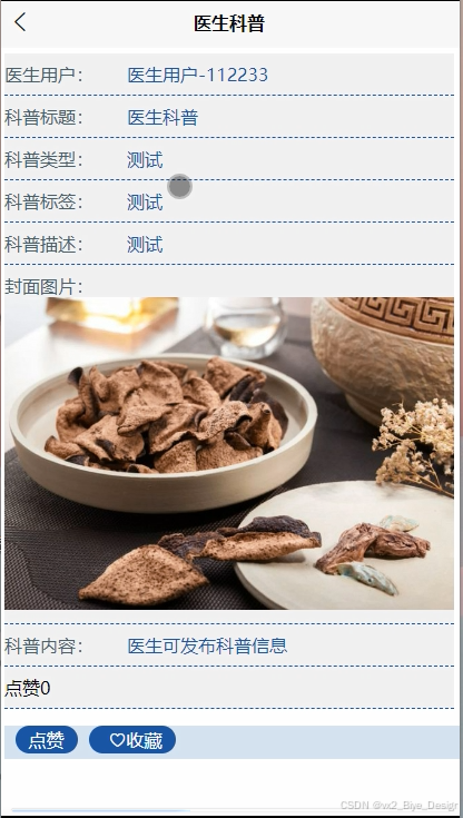 用户点击医生科普可以进入医生科普列表,点击任意一个医生科普信息后将可以进入到该医生科普的详情界面中,医生用户和普通用户都可以查看、点赞、收藏、评论医生科普的详细介绍,医生用户还可以在“我的”页面“医生科普”中发布自己的科普文章,医生科普详情界面如下图4-5所示。