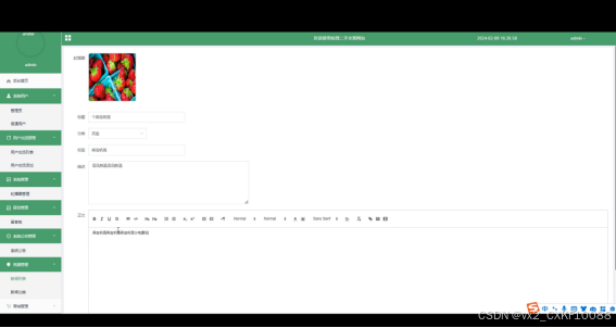 新闻资讯管理:管理员可以发布、编辑和删除新闻资讯,更新校园生活和二手交易相关的新闻内容。可以设置新闻的展示顺序和分类。界面如下图所示。