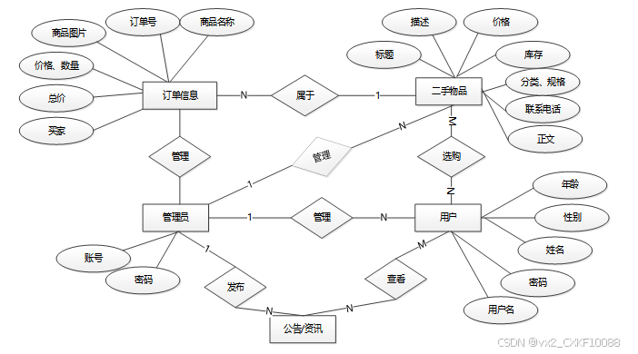下面是整个校园二手交易网站中主要的数据库表总E-R实体关系图。
