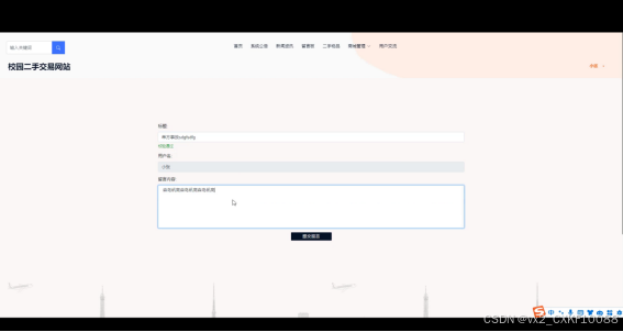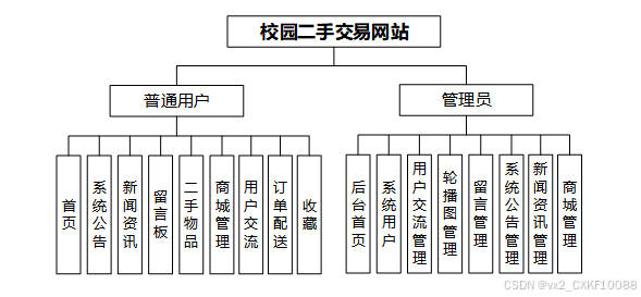 校园二手交易网站旨在为学生提供便捷、安全和高效的二手物品买卖服务。该平台具备首页展示、系统公告、新闻资讯、留言板、二手物品选购和发布、商城管理、用户交流、订单配送以及收藏等功能。同时,管理员拥有后台首页、系统用户管理、用户交流管理、轮播图管理、留言管理、系统公告管理、新闻资讯管理和商城管理等功能。具体如下: