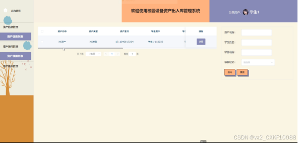 - 资产领用管理:用户在些页面可以看所有的资产领用信息,如资产名称、学生姓名、学部名称、审核状态等功能操作。