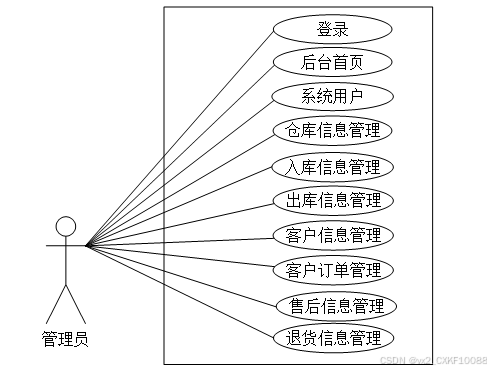 (1)管理员模块:系统中的核心用户是系统管理员,管理员登录后,通过管理员菜单来管理后台系统。主要功能有:首页、系统用户、仓库信息管理、入库信息管理、出库信息管理、客户信息管理、客户订单管理、售后信息管理、退货信息管理等功能。管理员用例图如图3-1所示。