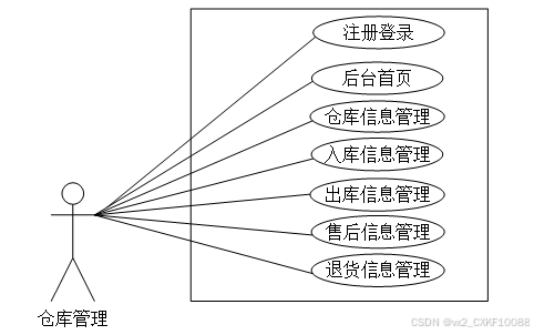 (2)仓库管理:后台首页、仓库信息管理、入库信息管理、出库信息管理、售后信息管理、退货信息管理等功能。用户用例图如图3-2所示。
