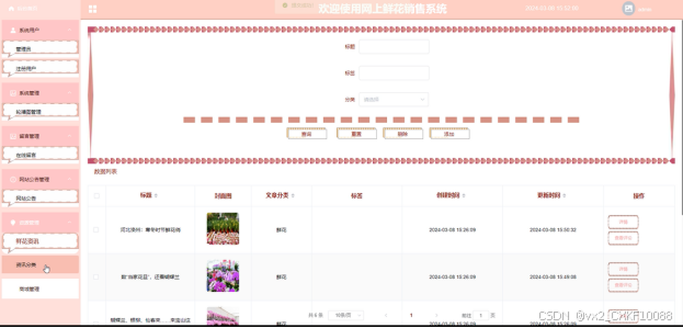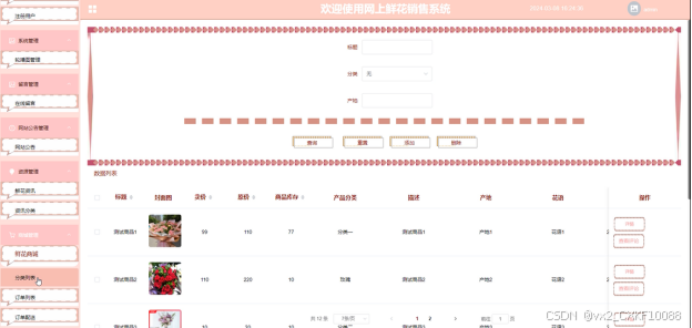 In terms of design, this article first analyzes the business requirements of online flower sales, and based on this, designs the overall architecture and database model of the system. The backend of the system includes multiple core modules, including system users, system management (carousel management), message management, website announcement management, resource management (flower information, information classification), and mall management (flower mall, classification list, order list, order delivery). Each module has been meticulously divided and designed to ensure the stability and scalability of the system.