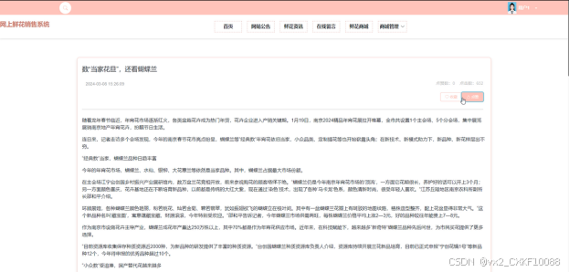 当注册用户点击“鲜花资讯”后,用户可以查看资讯详情,并可进行点赞、收藏、评论等操作,界面如下图4-6所示。