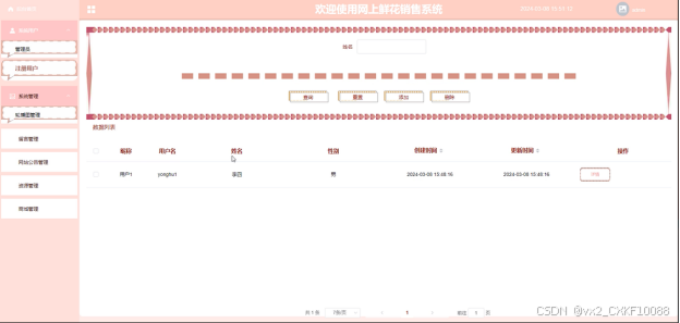 基于SpringBoot的网上鲜花销售系统中的管理人员是可以对注册的注册用户进行管理的,也可以对管理员进行管控。界面如下图4-10所示。