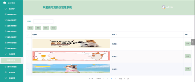管理员点击系统管理下方的“轮播图管理”可以查看轮播图列表中某一轮播图详情,可以对轮播图信息进行查询、添加、重置和删除操作。点击列表上方的“添加”进入页面填写标题、上传图片后点击“提交”即可完成轮播图的添加。其界面如下图4-15所示。