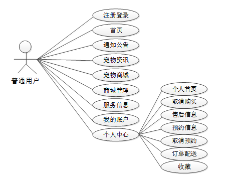 普通用户功能主要包括注册登录、首页、通知公告、宠物资讯、宠物商城、商城管理、服务信息、我的(我的账户、个人中心)。其用户用例图如下图2-3所示: