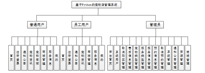 按照基于Python的宠物店管理系统的角色,主要包括普用户、员工用户和管理员这三大功能模块。