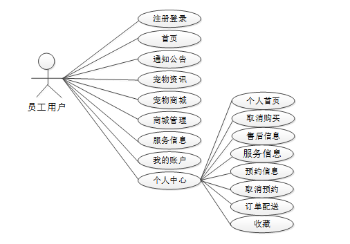 员工用户功能主要包括注册登录、首页、通知公告、宠物资讯、宠物商城、商城管理、服务信息、我的(我的账户、个人中心)。其用户用例图如下图2-4所示: