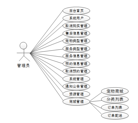 管理员功能主要包括后台首页、系统用户、取消购买管理、售后信息管理、宠物类型管理、服务类型管理、服务信息管理、预约信息管理、取消预约管理、系统管理、通知公告管理、资源管理、商城管理其用例图如下图2-5所示:
