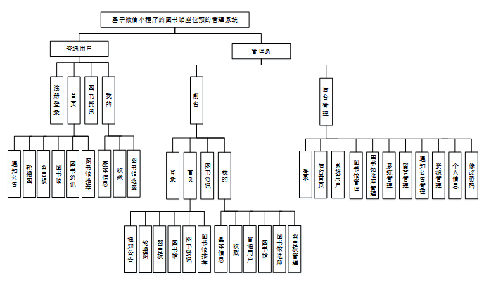 功能需求分析是每个系统开发设计必不可少的一部分,系统质量的好坏可以直接影响系统的存活问题,所以我们必须要将功能任务需求分析做到位,图书馆座位预约管理系统的设计在初期的分析是尤为重要的,通过任务分析可以更顺利的进行系统设计,并且保证了用户的满意度。根据基于微信小程序的图书馆座位预约管理系统的需求分析,主要分为普通用户和管理员这两大板块。具体如下