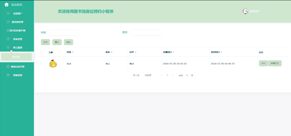 可查看所有留言板信息,进行查询和删除操作,支持标题、昵称搜索,可点击查看详情,和点击回复,填写并提交回复信息,留言回复需在后台才可进行回复。界面如下图所示。