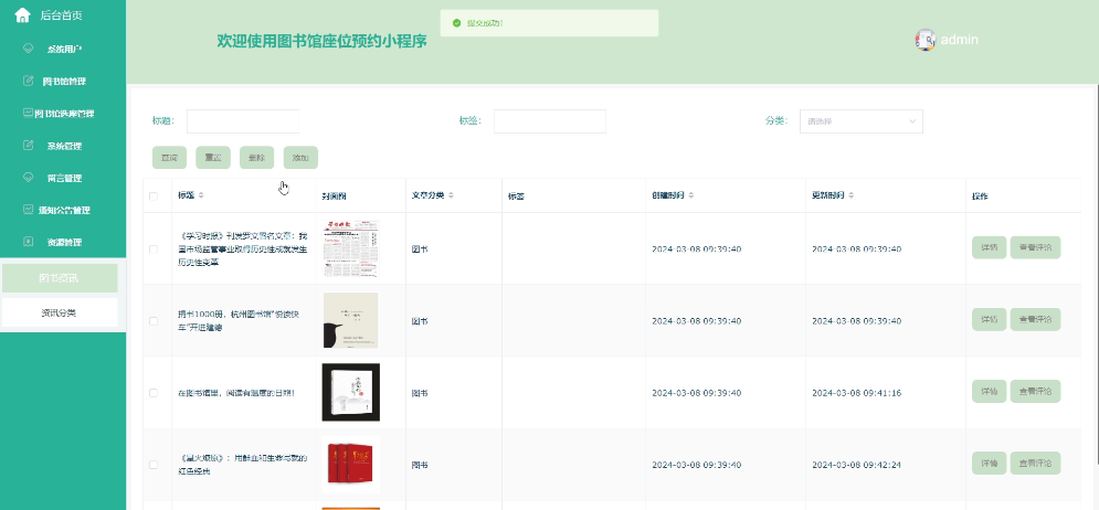 可对图书资讯和资讯分类进行管理,进行增删改查操作,图书资讯支持标题、标签、分类搜索,可点击查看详情(封面图、标题、分类、标签、描述、正文)和查看评论;资讯分类支持类型名称搜索,点击可查看详情。界面如下图所示。